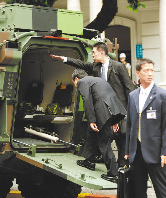 馬英九進入“云豹”裝甲車 (圖片來源:臺灣《聯(lián)合報》)
