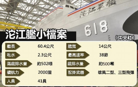 臺海軍稱,沱江軍艦長60.4米、寬14米、最高速率38節,滿載排水量約502噸、輕載排水量約449噸、搭載41員;船體由鋁合金打造,續航力達2000海里(約合3700公里),足以由臺灣本島航行到南沙太平島來回,未來加入海軍戰備行列后,“將有助臺灣對南海海域巡弋任務。”