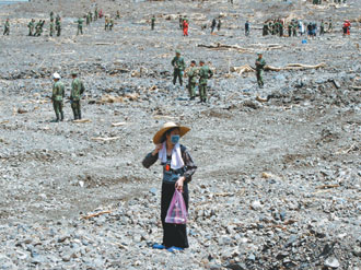 臺軍六軍團二六九旅有102名官兵支持新開部落挖掘工作,已進入第3天,由于泥石流深達數十米,雖然已用上挖土機,但進度緩慢。居民說,原本罹難者居住的村落前面還有座小山丘,現在只剩下平坦的泥石,可見泥石埋得有多深。由于土壤在烈日下曬成干泥,血水不再流出,臺軍官兵用鏟子挖掘非常困難,更別說尋找遺體。臺軍弟兄昨天排成一長排,挖掘出一個個小洞,幾乎要趴到洞中捧著泥土聞味道,“這邊的沒有酸味!換下一處!”他們的辛勞令災民感動。