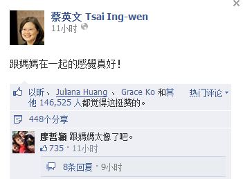 蔡英文臉書人氣依舊,母親節(jié)合照有14萬多名網友按贊關注。馬英九前天所刊出的《慈母良師一甲子,永世難報養(yǎng)育恩─悼亡母厚修女士》一文,也有近17萬網友按贊。(中國臺灣網 周劍)
