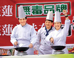 國民黨主席馬英九(左)與花蓮縣長候選人杜麗華(右),一同裝扮成廚師炒菜,為光豐農會無毒農業代言。圖片來源:臺灣《中國時報》