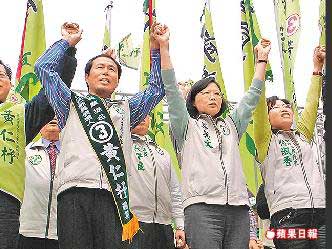 蔡英文(右2)昨到中壢市,為“立委”補選參選人黃仁杼成立競選總部站臺。圖片來源:臺灣《蘋果日報》