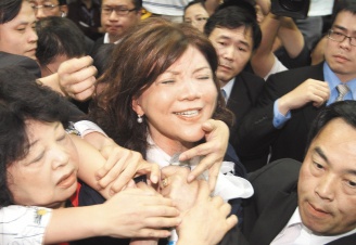 臺灣“立法院教育及文化委員會”上午排定審查大陸學(xué)生赴臺學(xué)習(xí)相關(guān)法案,會議主席趙麗云因為堅持要主持會議,藍(lán)綠雙方陣營從主席臺不斷拉扯轉(zhuǎn)移到備詢官員席,現(xiàn)場人員擁擠,趙麗云疑似被人勒住脖子,短暫缺氧而昏倒,最后在同黨籍女民代陪同下,搭出租車赴臺大醫(yī)院就醫(yī)。