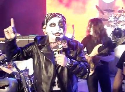 2010搖滾臺(tái)中樂團(tuán)節(jié)明天在臺(tái)中圓滿劇場登場,臺(tái)中市長胡志強(qiáng)(左二)特地扮成重金屬搖滾歌手現(xiàn)身記者會(huì)場,為活動(dòng)暖身