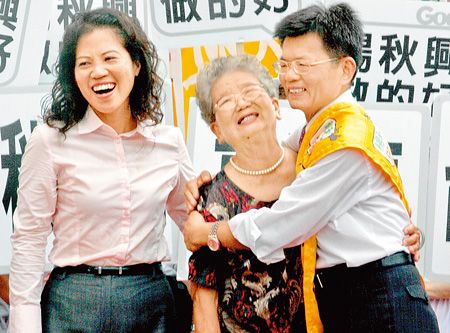 母親(中)親手為他披掛競選彩帶,楊秋興(右)夫妻感動不已,緊抱著母親致謝。 來源:臺灣《中國時報》