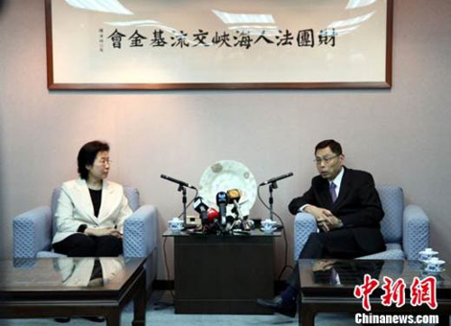 10月27日,大陸海協(xié)會(huì)副秘書(shū)長(zhǎng)張勝林等抵達(dá)臺(tái)灣,了解在臺(tái)灣蘇花公路失蹤的20名大陸同胞的搜救進(jìn)展情況。圖為張勝林(左)下午會(huì)見(jiàn);鶗(huì)副董事長(zhǎng)高孔廉。中新社記者 陳立宇 攝