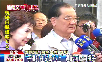 連戰夫婦凌晨才回家,一早又急著到醫院探視連勝文,連戰滿臉沉痛地說,子彈打在連勝文的身上,卻痛在父母的心里,臺灣選舉不應該走血腥暴力道路,希望連勝文滿身的血不要白流。面對媒體,連戰夫人連方瑀不敢開口,擔心一說話眼淚又止不住留下來。