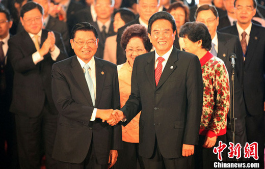 臺(tái)灣海峽交流基金會(huì)(;鶗(huì))董事長(zhǎng)江丙坤20日晚上在臺(tái)北圓山大飯店12樓宴請(qǐng)大陸海峽兩岸關(guān)系協(xié)會(huì)(海協(xié)會(huì))會(huì)長(zhǎng)陳云林等協(xié)商代表團(tuán)成員。