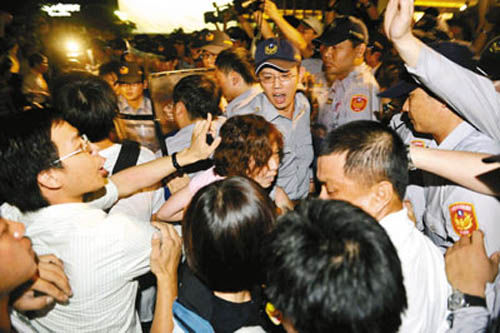 資料圖:2008年11月,陳云林赴臺(tái),民進(jìn)黨煽動(dòng)綠營(yíng)民眾鬧事數(shù)百人用石塊、棍棒攻擊警察,深夜還有人擲汽油彈形成火海。7日凌晨,鎮(zhèn)暴噴水車朝現(xiàn)場(chǎng)噴水柱強(qiáng)制驅(qū)離人群。這場(chǎng)流血事件,堪稱臺(tái)灣近十年來(lái)最嚴(yán)重的警民沖突。
