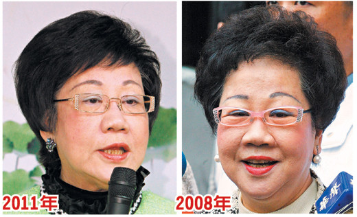 比較相隔三年的呂秀蓮照片,三年前呂秀蓮頂著蓬蓬卷發,很像典型的“歐巴桑頭”,皮膚也顯得較為凹凸不平,當時她的臉比較圓,戴著粉紅塑脂框眼鏡,較重的淺藍眼影,和鮮紅的唇色呈現較強烈的對比,整個人顯得比較強勢,具攻擊性。