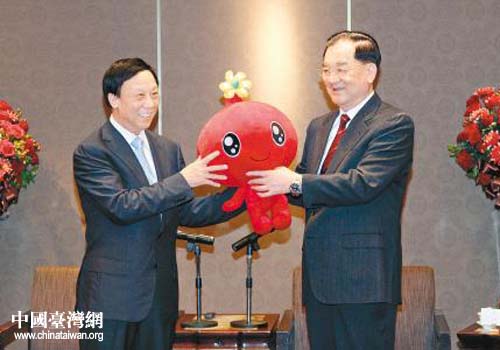 中共陜西省委常委、西安市委書記孫清云向國民黨榮譽(yù)主席連戰(zhàn)贈(zèng)送西安世園會(huì)吉祥物(陜西省臺(tái)辦通訊員 霍炳男 攝)