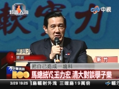 臺灣清華大學慶!鞍倌晷c”,3月29日邀請馬英九與臺灣偶像歌手王力宏以為題 “夢想造就軟實力”對談。據臺灣《今日新聞》報道,61歲的馬英九和35歲的王力宏都穿著西裝搭牛仔褲出席,主持人、前臺灣清華大學校長劉炯朗一度要求兩人唱歌,馬英九笑說,“在王力宏面前班門弄斧,不是要我老命嗎?”王力宏則說,“總統(tǒng)”應該不好當吧?后來王力宏清唱一段英文歌,才引導馬英九唱出一個字,博得全場熱烈掌聲。