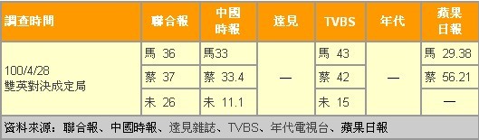 2012年臺灣大選“雙英”對決成局后,臺灣各家媒體都做了最新選情民調(diào),《聯(lián)合報》調(diào)查結(jié)果,雙英呈現(xiàn)五五波局面,但是臺灣《蘋果日報》調(diào)查結(jié)果,蔡英文支持度大幅領(lǐng)先馬英九。圖片來源:臺灣《聯(lián)合報》