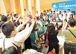 新北市政府29日舉辦大市長與小市長的高峰對談,小市長會后與大市長朱立倫合影,臺下小市長的爸爸、媽媽們,則拿著相機搶著為兒女留下這值得紀念的一刻。圖片來源:臺灣《中國時報》