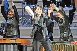 朱宗慶打擊樂團《擊度震撼》在臺北小巨蛋演出,結合舞蹈表演,帶來聽覺與視覺享受。周美青登臺參與演出,掀起高潮,臺下叫好聲不斷。(圖片來源:臺灣《中國時報》)