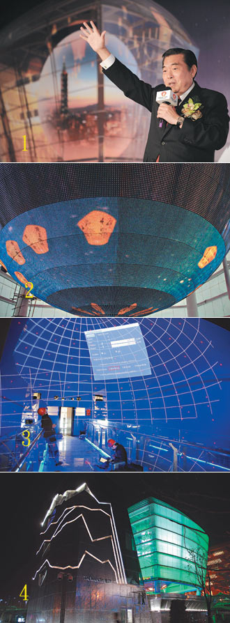 臺北世貿中心董事長王志剛主持2010年上海世博臺灣館啟航記者會(圖1),館內設計及展演內容首度曝光。包括館內的巨型LED球體(圖2),館內4樓設有直徑12米的720度圓球形劇場(圖3),館上刻有名山陵線(圖4)。來源:網絡圖片
