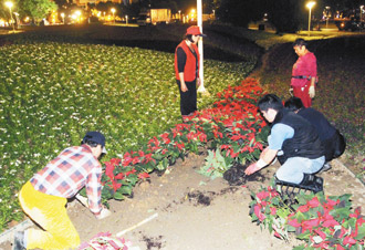 花博昨晚在結束參觀后連夜換花,出動大批工作人員,將圓山園區的地景花海換成圣誕紅。圖片來源:臺灣《聯合報》