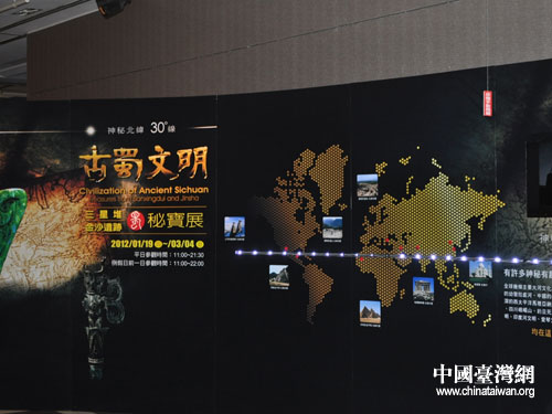 臺北是“神秘北緯30度線——三星堆、金沙古蜀文明秘寶展”的第一站,展至3月4日,此后還將到臺中、高雄巡回展出,于2012年6月10日結束。據介紹,展覽門票已經有近5萬人次預訂,主辦方預計,整個展覽將吸引40萬以上臺灣民眾參觀展覽。
