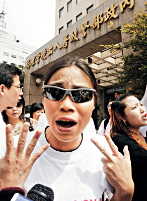 圖:許多前來辦理手續的大陸新娘在“內政部”出入境管理局門口臨時加入抗議陣容,激動地向媒體控訴在臺灣受到當局的歧視。