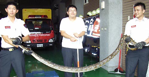 臺中市東英消防分隊(duì)昨天捕獲一條蟒蛇。(圖:東森新聞)