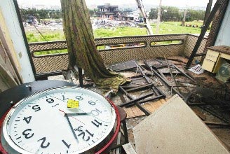 苗栗縣后龍鎮地下爆竹廠昨天爆炸,工廠60米外的一戶民宅,屋頂門窗全毀,屋內時鐘還停留在爆炸發生時的10時3分。《聯合報》記者陳易辰攝