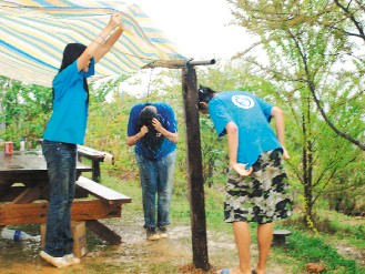 紀蜜俐在印度邊境村落當志工,因水資源珍貴,臺灣的志工擔心浪費當地儲水,不敢洗澡,臺風前下了一場大雨,大伙興奮地在雨中洗頭。 聯合報圖