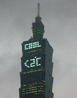 中國臺灣網4月21日消息 臺灣環境質量文教基金會今天晚上在臺北市府前廣場舉辦“臺灣氣候密碼行動”,由臺灣地區領導人當選人馬英九、臺北市長郝龍斌、101大樓董事長陳敏熏、臺灣紅十字協會董事長陳長文等共同主持點燈儀式,同步點亮101大樓上“〈2℃ ”“COOL ”字樣,倡導節能環保。