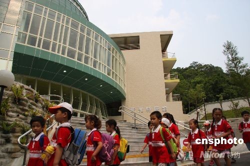 8月14日,歷經實地勘察及長達三個半小時的開會審查,臺灣“農委會林務局”通過大熊貓輸入案,大陸贈送臺灣同胞的兩只大熊貓“團團”、“圓圓”將落戶臺北市立動物園。圖為當日,一群小學生途經巨資興建的臺北市立動物園熊貓館。 中新社發 董會峰 攝