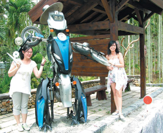中新網6月26日電 據臺灣《聯合報》報道,南投縣日月潭畔的魚池鄉武登村民石凱倫,將已廢校的光明小學轉型為生態旅游中心,營造特色環保意象,25日完成一座以6輛報廢摩托車拆解零件創作的“環保變形金剛”,吸引路過游客停車參觀,成了觀光地標。