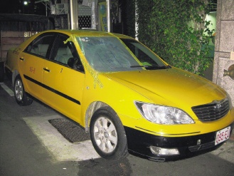 出租車司機(jī)林淵晟疑口角引殺機(jī),昨天凌晨在臺(tái)北市八德路從后方撞死乘客杜贊修,報(bào)警后又逃逸無蹤。林的出租車在汐止新臺(tái)五路尋獲,前擋風(fēng)玻璃右側(cè)撞出大洞。(圖片來源:臺(tái)灣《聯(lián)合報(bào)》)