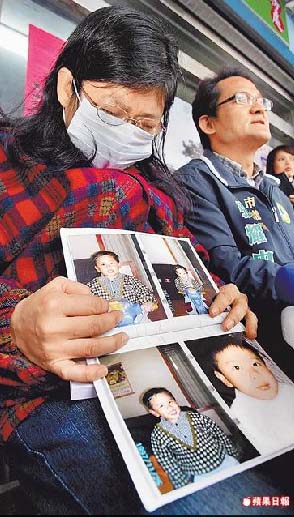 沈姓男童疑因施打甲流流感疫苗猝死,他的母親昨天手持兒子照片出席記者會,難忍悲痛數度哭泣。 來源:臺灣《蘋果日報》