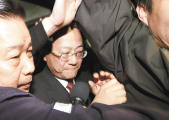 臺檢方特偵組約談臺新金董事長吳東亮(中),昨天凌晨結束約談后,吳東亮由多名保鑣護衛(wèi)步出特偵組,閉口不回應媒體問題。(圖:臺灣《聯合報》)
