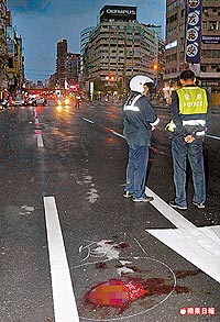 事故現(xiàn)場(chǎng)留下大灘血跡,但沒(méi)有監(jiān)視器錄下經(jīng)過(guò)與肇事逃逸車輛信息。圖片來(lái)源:臺(tái)灣《蘋果日?qǐng)?bào)》