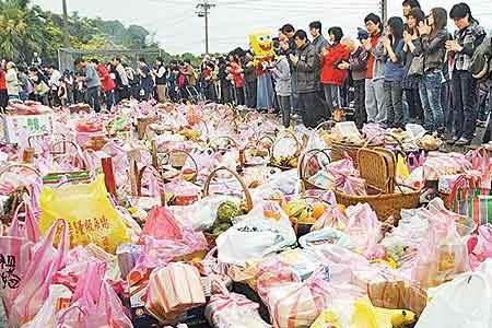 葉姓子孫帶著三牲、素果前來祭祖,一籃籃祭品堆滿廣場。圖片來源:臺灣《蘋果日報》