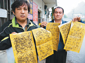 新竹縣尖石鄉新樂村水田部落最近陷入“蒼蠅危機”,圖為粘滿蒼蠅的黏蠅板。圖片來源:臺灣《聯合報》