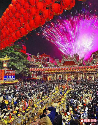 中國臺灣網4月17日消息 綜合臺灣媒體報道,臺灣年度宗教盛事,臺中縣大甲鎮瀾宮媽祖繞境活動,昨晚上11時起駕,沿途鑼鼓喧天、鞭炮聲不斷,10多萬名信眾夾道祝禱膜拜,大甲鎮形同不夜城。今年的活動締造許多新紀錄,首度增至9天8夜、時間最長;首次可望破百萬人次參加、人數最多;適逢選舉年,藍綠政治人物爭相曝光,政治味也最濃。