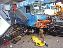 臺中縣清水鎮16日傍晚發生嚴重車禍,20噸吊車疑因剎車失靈,連續追撞12部車,現場多部汽車被撞得如疊羅漢,造成2死6傷慘劇。 來源:臺灣《中國時報》