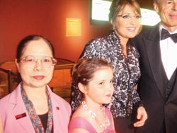 臺灣愛心阿嬤陳樹菊(前左)赴美接受《時代》表揚,昨天她穿著樸實出席善行晚宴。大方向美國共和黨政治明星裴林(后左)致意。圖片來源:臺灣《中國時報》