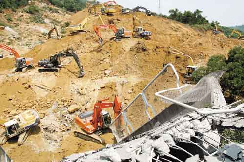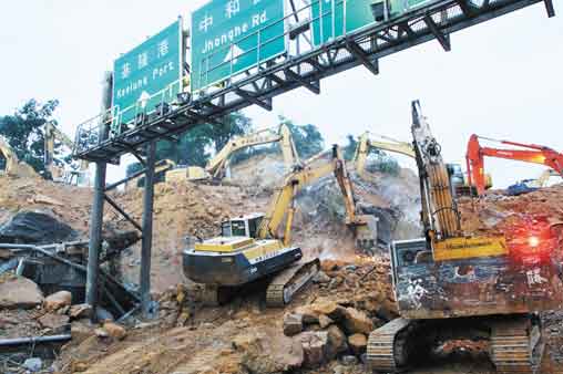 臺高速公路三號七堵段發(fā)生走山意外,各式機具連夜挖掘搶救,希望加快速度救出疑遭掩埋的車輛與駕駛。資料圖片