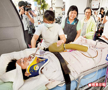 在場學生嚇得報告老師和學校護士,張童不斷哀叫:“全身好痛!”口吐鮮血送醫急救。張童在臺灣造船公司上班的父親和開設面館的母親聞訊趕到醫院,張母不斷哭喊:“你要加油”、“媽媽心好痛,你怎么摔成這樣?”醫院診斷張童腦部輕微出血、氣胸、左肺挫傷、肺積水等現象,轉送高雄醫學大學附設醫院手術急救,有生命危險。