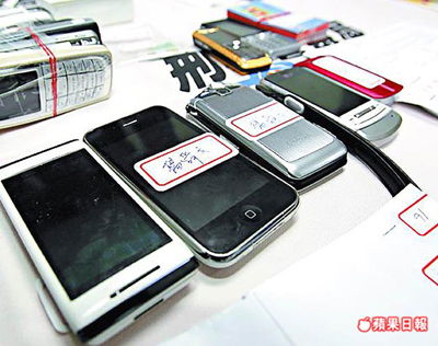 嫌犯鐘國裕(上圖)為逃避追緝,讓手下帶十多支手機(下圖),搭高鐵接電話詐騙。圖片來源:臺灣《蘋果日報》