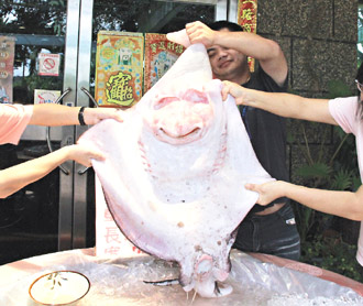 中國臺灣網8月18日消息 據臺灣《聯合報》報道,嘉義縣一海產餐廳的海釣船日前在恒春外海捕獲一條大魚,外型似魟,從尾部拉起攤開,腹部血肉紋理竟像張猴臉。店家將怪魚展示在店門口,有饕客被怪魚嚇到,直說“好恐怖,這禮拜不敢吃魚。”