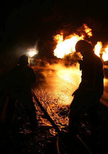 臺灣一輛載有對二甲苯的化學槽車17日凌晨行經三號高速公路北上155.5公里苑里路段,撞上1輛轎車,翻覆滑落邊坡爆炸引發大火,警消出動搶救。 圖片來源:“中央社”