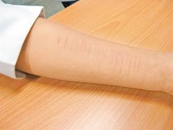 其中一位自稱失戀的男生,坦承從小學(xué)開始,心情不好時(shí)就會劃手發(fā)泄情緒。還有一名學(xué)生是在假日時(shí),整天玩計(jì)算機(jī)被家長禁止,親子關(guān)系緊繃,結(jié)果就負(fù)氣劃手讓家長看。另有4名女生則是“搏氣魄”,彼此詢問“敢不敢?”就劃下去了!