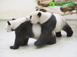 趙明杰說,團團與圓圓一入洞房即發(fā)揮本能,團團不斷對圓圓咬尾、咬臀、追逐、爬跨,最后成功騎上圓圓,表現(xiàn)算是不錯了;團團對圓圓咬著不放,圓圓被咬久了也會痛,就這樣拖著120多公斤的團團,也很辛苦。