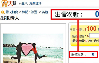 有網友在拍賣網站以100元起標,在情人節當天拍賣自己充當情人,但無人出價(紅框處)。來源:臺灣媒體