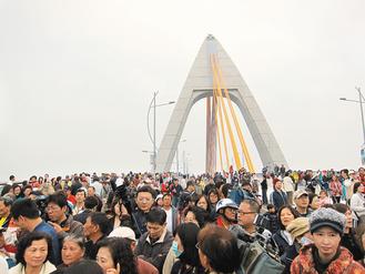 全臺第一座開啟式景觀橋“鵬灣跨海大橋”昨天通車,民眾涌上大橋拍照同樂。圖片來源:臺灣《聯合報》