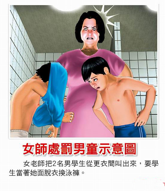 中國臺灣網4月18日消息 據臺灣媒體報道,臺灣校園又傳不當體罰事件。臺北巿一所小學的一名體育女老師因不滿2名男學生上完游泳課后,在更衣間內嬉鬧喧嘩,竟把學生叫出來當著她面脫光換衣服,致男學生身心受創,回家狂哭不已。該校校長表示,昨已決定對女老師記過處分。臺北市教育局指事件可能涉及校園性騷擾,已要求學校徹查。