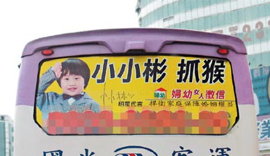 據(jù)臺(tái)灣《聯(lián)合報(bào)》報(bào)道,臺(tái)灣知名童星小小彬替征信業(yè)者代言,寫著“小小彬抓猴”(“抓猴”意為抓外遇)的廣告牌,放在客運(yùn)車上在臺(tái)灣“趴趴走”,臺(tái)中市議員抨擊“兒童抓猴”是負(fù)面教育,市長(zhǎng)胡志強(qiáng)認(rèn)為很不妥,且違反“兒少法”,下令今天起“不撤廣告就開(kāi)罰”。