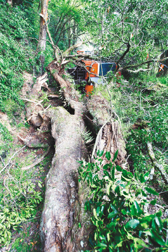 阿里山小火車翻覆意外,經現場勘查懷疑森氏櫟是白蟻與真菌蛀食枝干,導致枝干斷裂擊中小火車。圖片來源:臺灣《聯合報》